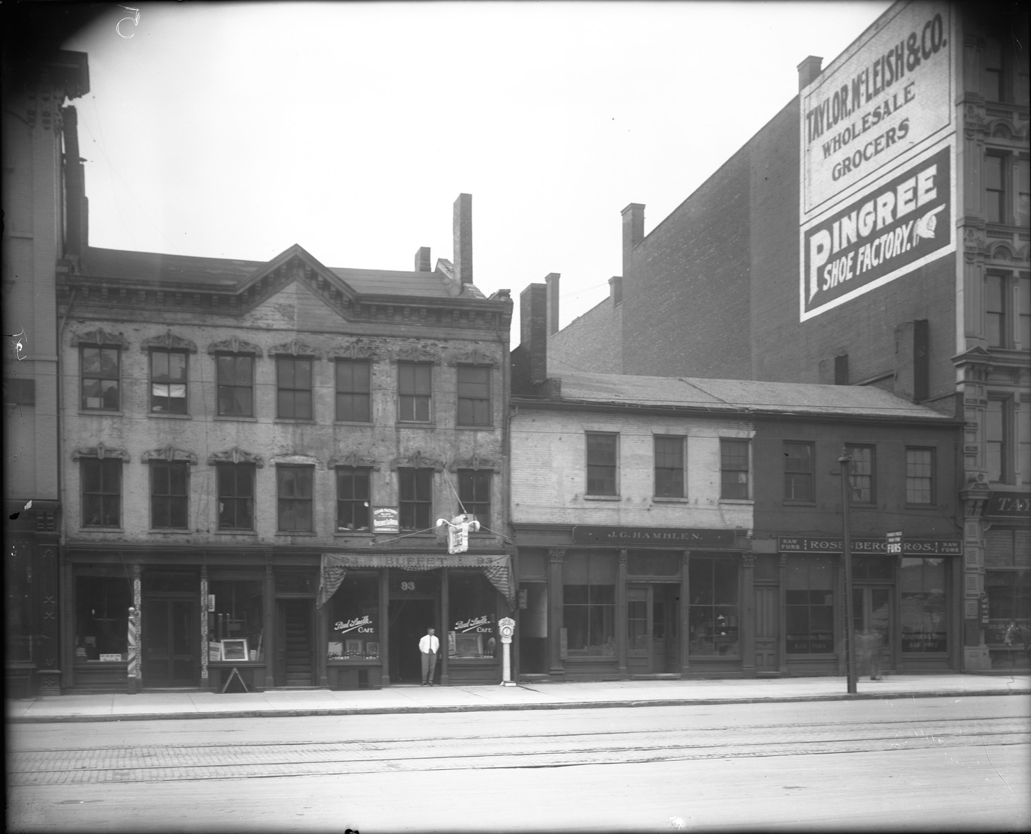 Favorite this☆ Businesses located on Jefferson Avenue Description: Businesses located on Jefferson Avenue include Rosenberg Bros., J.G. Hamblen, a barber shop, and Paul Smith Cafe, man standing in doorway of cafe, which has scale in front. Recorded in glass negative ledger: "D/Streets-Jefferson, west." Details Resource ID: EB02e268 Subject: Business establishments--Michigan--Detroit Restaurants--Michigan--Detroit Barbershops--Michigan--Detroit Glass negatives Date Issued: Unknown year Format: 1 negative : glass ; 8 x 10 in. Member of: Burton Historical Collection Negative Number: BHC glass neg. no. 1755 Rights: Physical rights are retained by DPL. Copyright is retained in accordance with U.S. copyright laws.