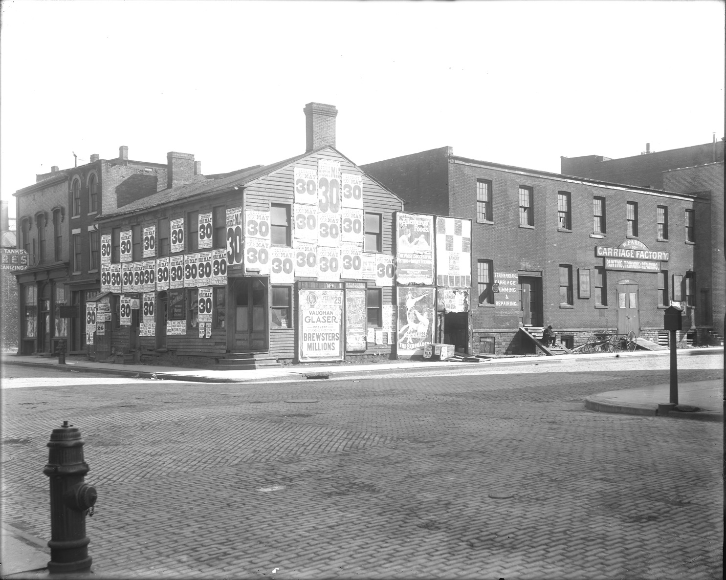 Corner of Randolph and Larned Streets, building on corner covered with advertisements, a man reading on the steps of the W. Parent Carriage Factory next door. Recorded in glass negative ledger: "D/Streets-Randolph & Larned."