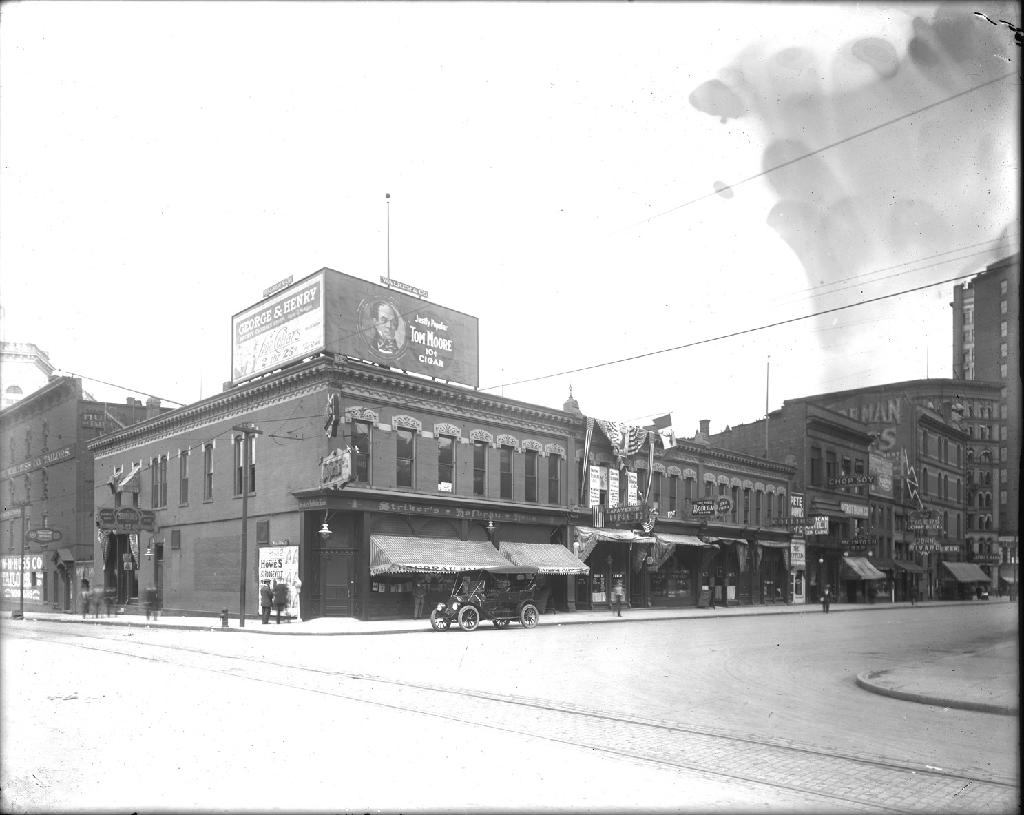 Striker's Hofbrau Haus with large billboards on rooftop advertising Tom Moore cigars and George and Henry Society Clothes Shop, next door is Lafayette Lunch, followed by the Tom Swan Chop House, Detroit Trunk Co., and McIntosh Bar. Recorded in glass negative ledger: "D/Streets-Lafayette."