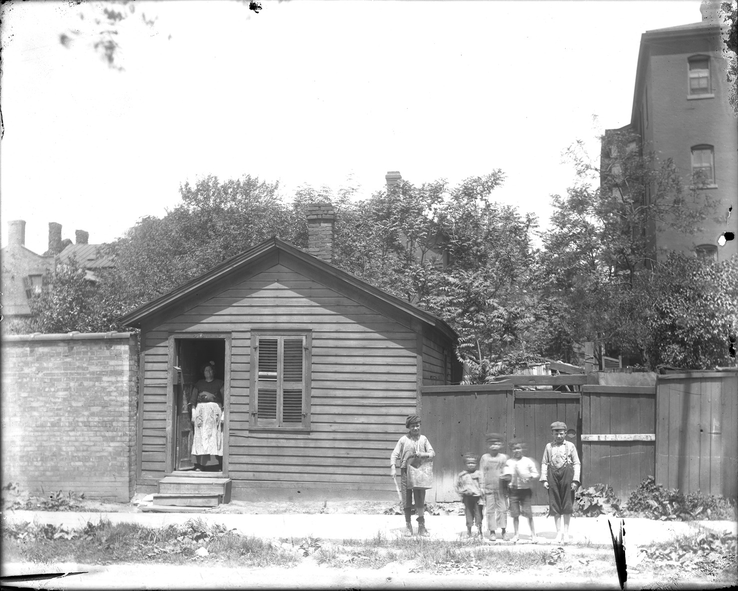 Woman standing in doorway of wood-framed house on Woodbridge Street., five boys, some barefoot, standing on wooden sidewalk, in front of wooden fence next to house, larger, stone houses in background. Recorded in glass negative ledger: "D/Streets-Woodbridge."