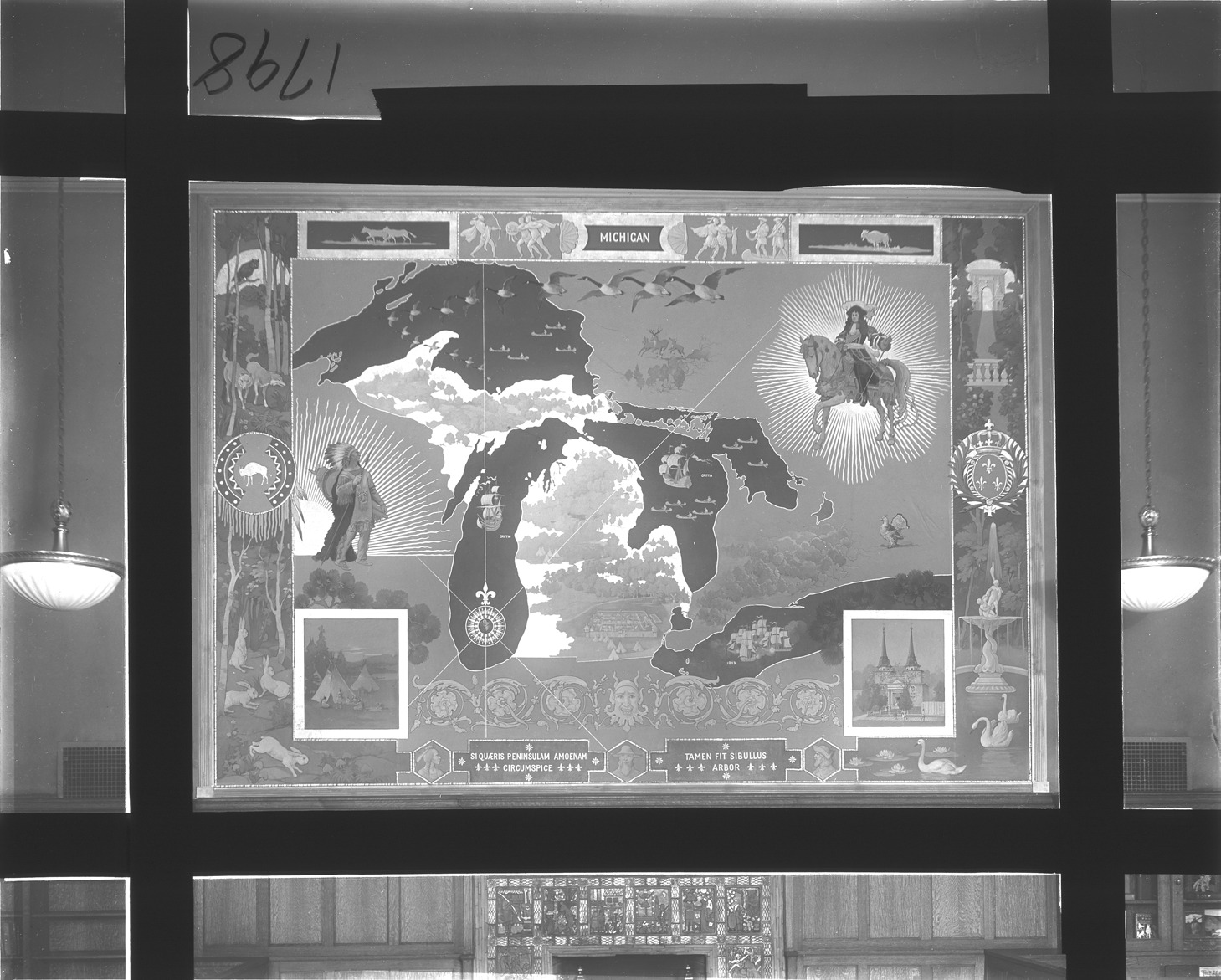 Mural of map of Michigan by Frederick J. Wiley located in the former Children's Room above the fireplace of Detroit Public Library. Mural was created in 1923. Recorded in glass negative ledger: "D/Libraries-Detroit public library, 1921-Murals & paintings." Image is masked off with black tape.