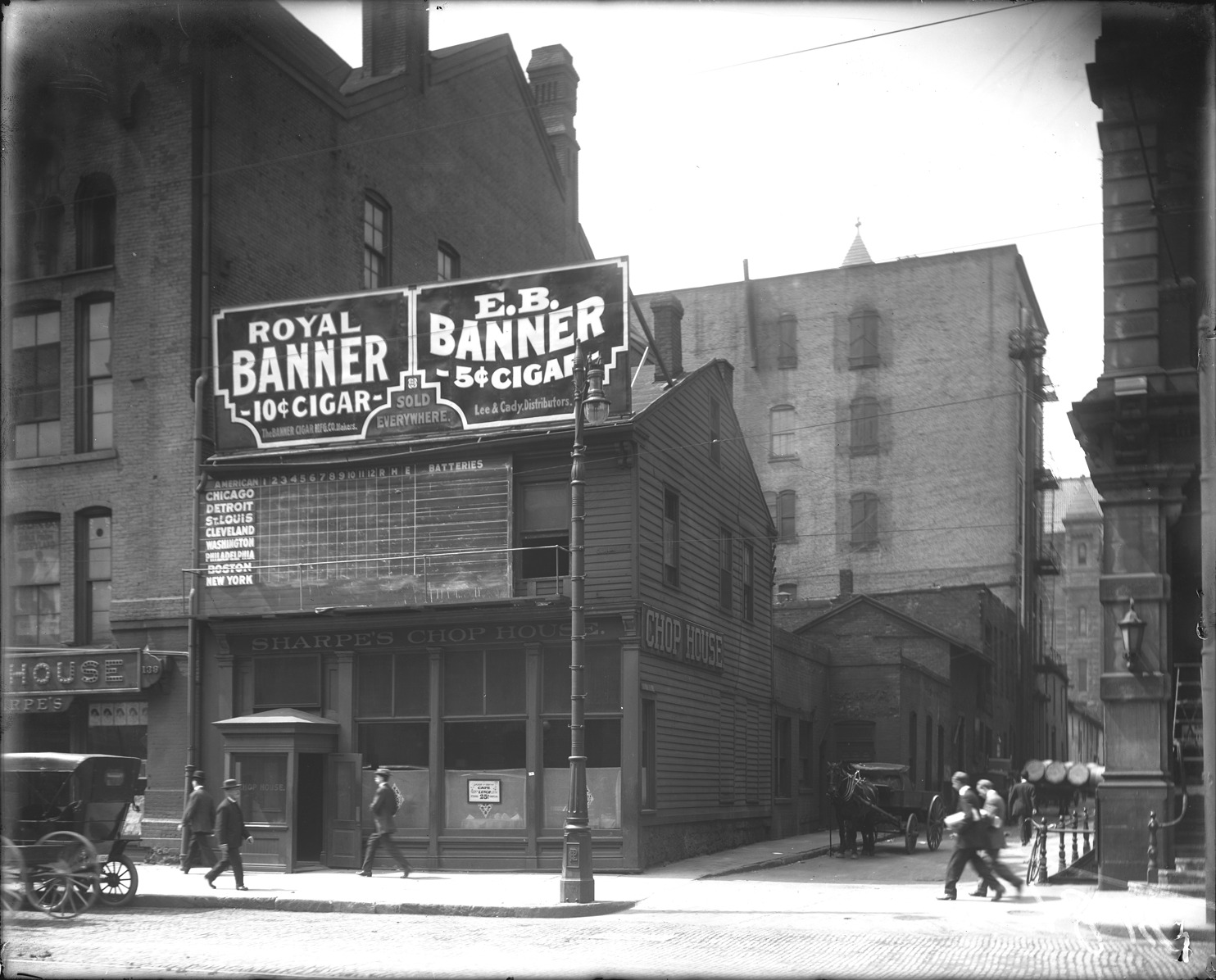 View of Sharpe's Chop House, several men in hats walking by, billboard on top advertising Royal Banner and E.B. Banner 10 & 5 cent cigars. Underneath billboard is chalkboard scoreboard with American League baseball teams. Recorded in glass negative ledger: "D/Restaurants-Sharpe's chop house, May 6, 1910, S.W. cor. Griswold."
