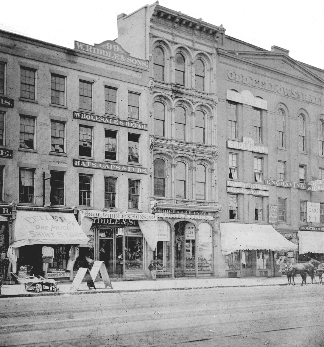 Favorite this☆ Clothing stores on Woodward Avenue Description: Petley Shirt Store, W. Riddle & Sons hats, caps & furs, Richard Fyfe boots & shoes, and the Oddfellows Hall on Woodward between Larned and Congress. Recorded in glass negative ledger: "D/Streets-Woodward." Details Resource ID: EB02e334 Subject: Clothing trade--Michigan--Detroit Shoe stores--Michigan--Detroit Fraternal organizations--Michigan--Detroit Glass negatives Date Issued: Unknown year Format: 1 negative : glass ; 7.75 x 7.25 in. Member of: Burton Historical Collection Negative Number: BHC glass neg. no. 1843 Rights: Physical rights are retained by DPL. Copyright is retained in accordance with U.S. copyright laws.