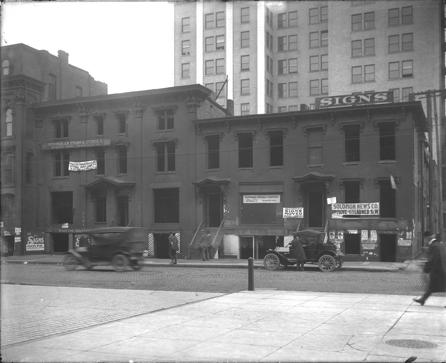 Empty building on Shelby, former locations of Peninsular Stamp & Stencil Co., Solomon News Co., and Jos. R. Martin Sign Co., and new home to Farquhar Furnace Co., brick pavement, two cars on street. Recorded in glass negative ledger: "D/Streets-Shelby, 7/6/15."