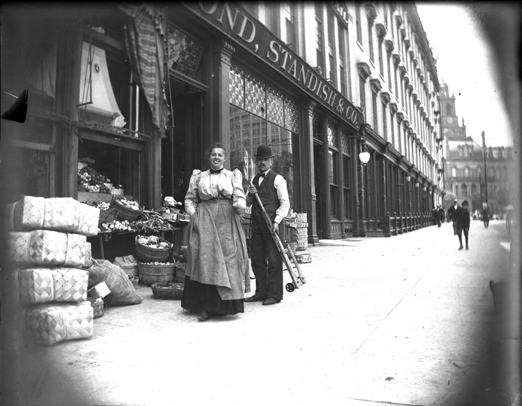 Man in bowler hat holding a wooden dolly and woman in long apron standing in front of Hammond, Standish & Co. fruit and vegetable store on Cadillac Square, straw baskets, produce visible, Wayne County Building in the background. Recorded in glass negative ledger: "D/Streets-Cadillac."