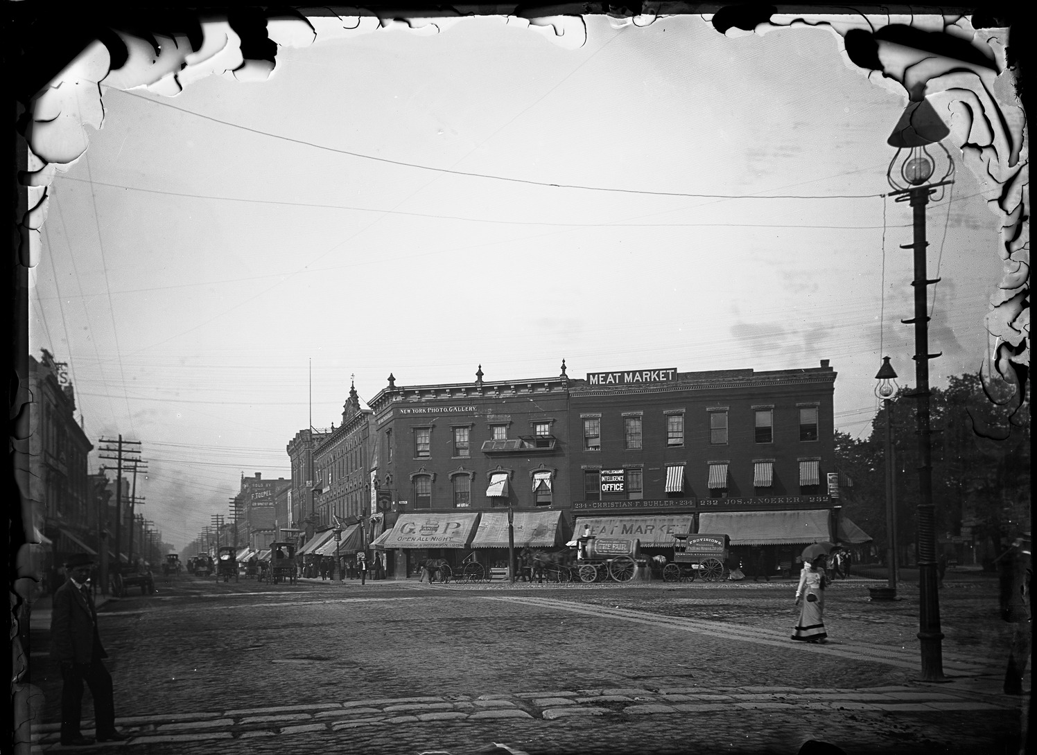Favorite this☆ Gratiot and Randolph Description: Meat market, Grunow & Patterson, horse drawn wagons,and other businessess on Gratiot and Randolph. Emulsion lifting from plate. Recorded in glass negative ledger: "LD/Gratiot & Randolph." Details Resource ID: EB02e364 Subject: Glass negatives Date Issued: Unknown year Format: 1 negative : glass ; 7.25 x 10 in. Member of: Burton Historical Collection Negative Number: BHC glass neg. no. 1873 Rights: Physical rights are retained by DPL. Copyright is retained in accordance with U.S. copyright laws.