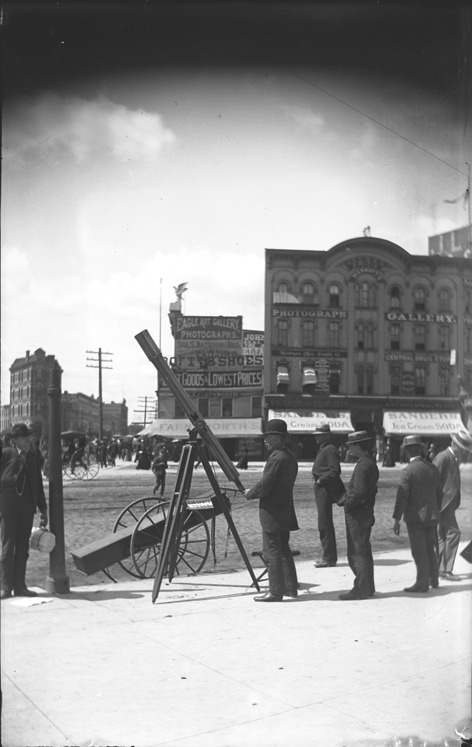 Favorite this☆ Telescope on street Description: Men standing on corner of Woodward and Michigan Aves., across from Sanders store, next to large telescope with sign "Sunpots today." Several photographic companies in background. Recorded in glass negative ledger: "D/Telescopes." Details Resource ID: EB02e405 Subject: Telescopes--Michigan--Detroit Ice cream parlors--Michigan--Detroit Photographers--Michigan--Detroit Men--Michigan--Detroit Glass negatives Date Issued: Unknown year Format: 1 negative : glass ; 5 x 3 in. Member of: Burton Historical Collection Negative Number: BHC glass neg. no. 1918 Rights: Physical rights are retained by DPL. Copyright is retained in accordance with U.S. copyright laws.