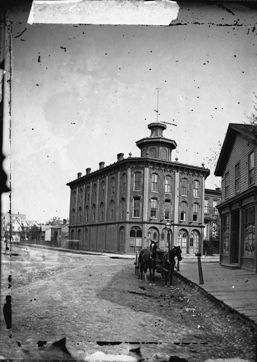 Brick and stone building with cupola at Grand River and Park Place, a horse-drawn wagon parked next to wooden sidewalk on unpaved street in front of billiard and rooming house. Recorded in glass negative ledger: "LD/Streets-Grand River & Park Place." Emulsion lifting from plate.
