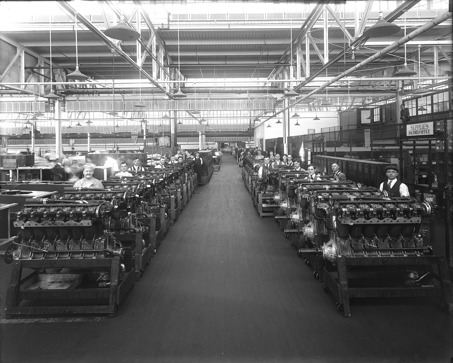 Auto factory workers with engines