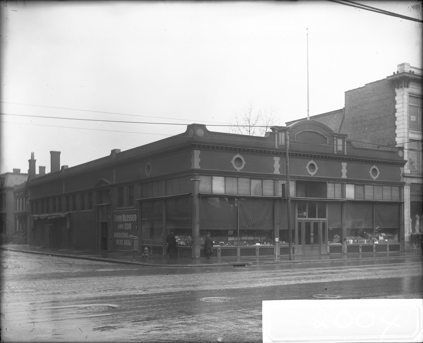 View of the John Blessed and Son grocery store located at 391-395 Woodward Ave., on the corner of Woodward Ave. and Henry Street. Man and boy look at food displayed in store windows. Brick wall sign reads: "John Blessed and Son, grocers and meat dealers." Recorded in glass negative ledger: "D/Industries & business houses-Blessed, John & Son."