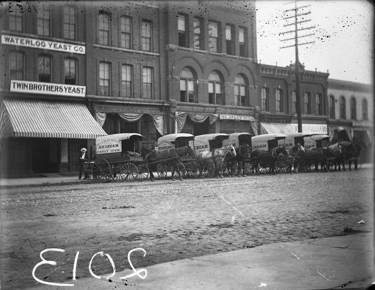Row of horse-drawn wagons in front of commercial buildings; sign on wagons reads in part: "Ice cream and fruit ices." Recorded in glass negative ledger: "D/Streets-Michigan, between Porter and Third."