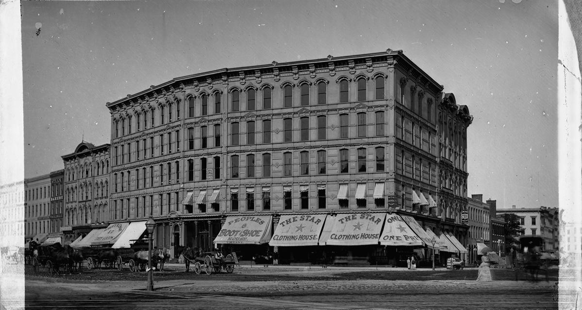 View of multistory Italianate commercial building on corner; building awnings advertise the Star Clothing House and Peoples Boot and Shoe House. Horse-drawn wagons in street. Recorded in glass negative ledger: "D/Streets-Monroe."