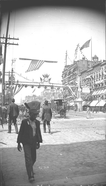 Street decorated for the Grand Army of the Republic National Encampment; buildings decorated with bunting; arch over street with hanging medallions, flags and and "G.A.R. welcome." American flag and banner reading "The old camp ground Washington 1892" suspended over street. Horse-drawn carriages in street. Recorded in ledger: "Conventions-G.A.R.-25th nat'l."