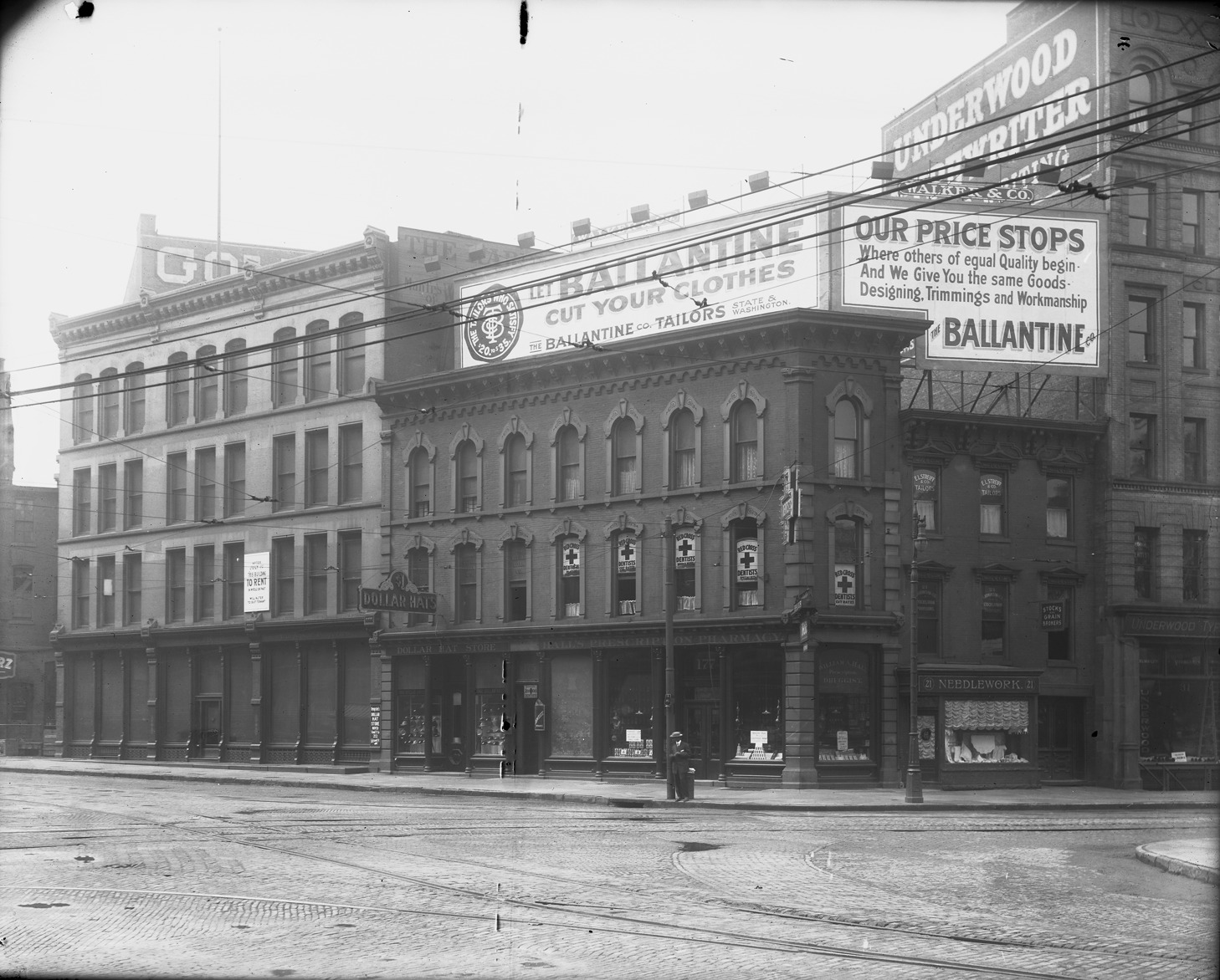 Favorite this☆ Businesses at Griswold and State Description: View of brick Italianate commercial building on corner; building houses William A. Hall prescription druggist, the Dollar Hat Store and Red Cross Dentists. Recorded in glass negative ledger: "D/Streets-Griswold & State." Details Resource ID: EB02e478 Subject: Commercial buildings--Michigan--Detroit Storefronts--Michigan--Detroit Glass negatives Date Issued: Unknown year Format: 1 negative : glass ; 8 x 9.75 in. Member of: Burton Historical Collection Negative Number: BHC glass neg. no. 2059 Rights: Physical rights are retained by DPL. Copyright is retained in accordance with U.S. copyright laws.