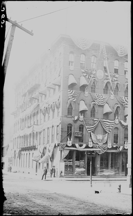 View of commercial building decorated with bunting and American flags for Grand Army of the Republic National Encampment. Recorded in ledger: "Conventions-G.A.R.-25th nat'l." Negative is faded.