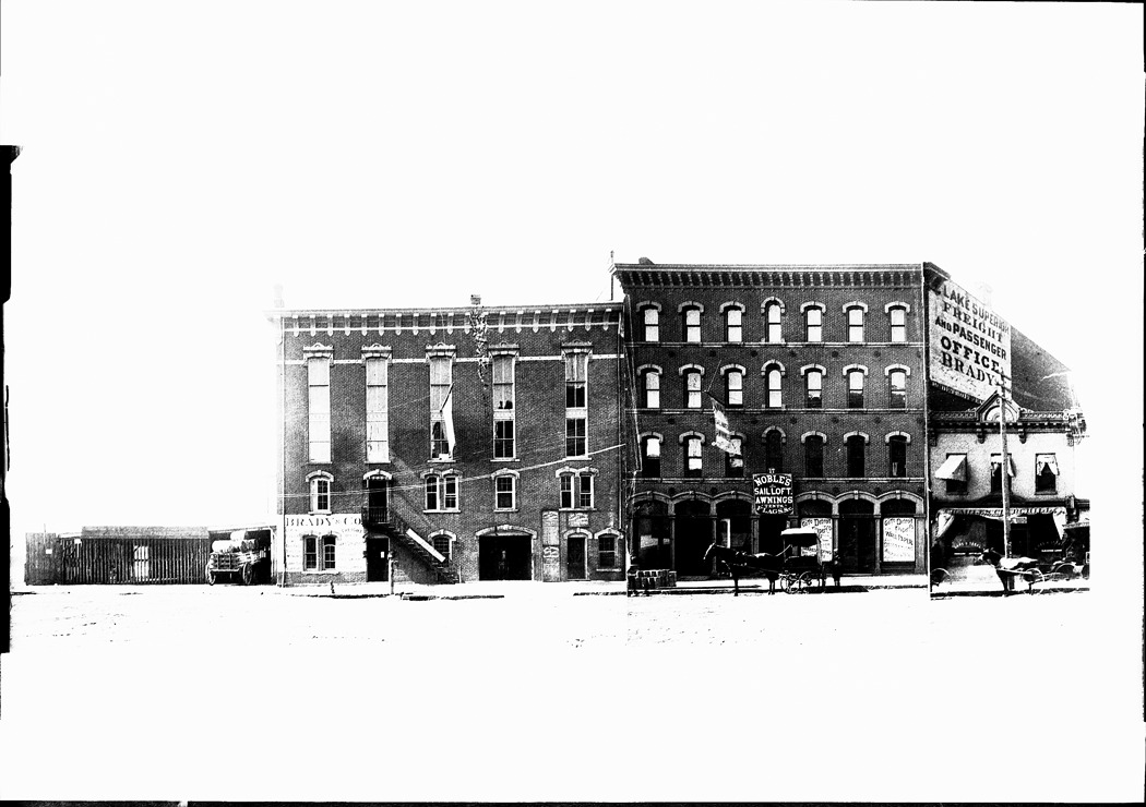 View of two Italianate brick commercial buildings; Brady & Co. and Noble's sail loft awnings. Recorded in glass negative ledger: "D/Streets-Woodward & River."