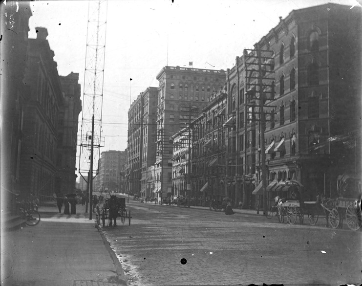 Favorite this☆ Businesses on Griswold and Congress streets Description: View of horse-drawn wagons, women with parasols, bicycles and people on sidewalk and a light tower. Recorded in glass negative ledger: "D/Streets-Griswold & Congress." Details Resource ID: EB02e521 Subject: Streets--Michigan--Detroit Horse-drawn vehicles--Michigan--Detroit Street lighting--Michigan--Detroit Glass negatives Date Issued: Unknown year Format: 1 negative : glass ; 5 x 4 in. Member of: Burton Historical Collection Negative Number: BHC glass neg. no. 2120 Rights: Physical rights are retained by DPL. Copyright is retained in accordance with U.S. copyright laws.