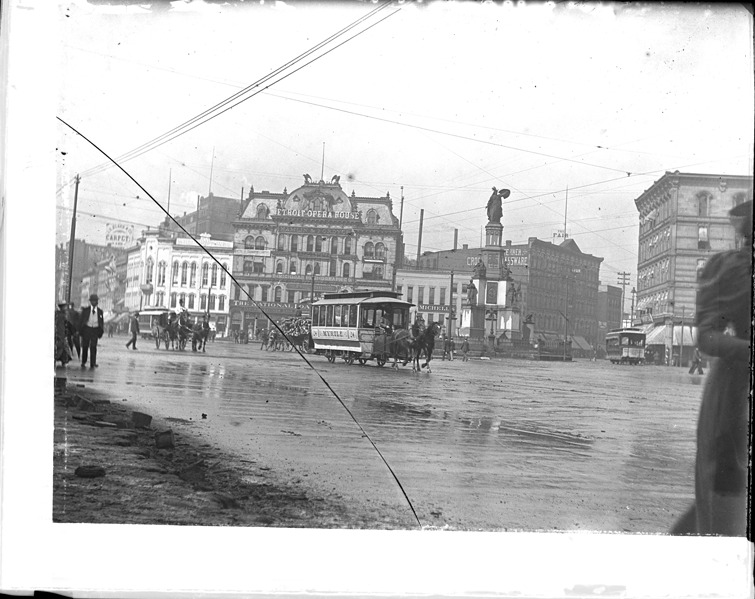 Favorite this☆ Corner of Woodward Avenue and Campus Martius Description: Detroit Opera House as seen from Woodward Avenue looking north, Soldiers' and Sailors' Monument and Myrtle Street horse-drawn trolley in view. Recorded in glass negative ledger: "D/Streets-Woodward & Campus Martius." Negative is cracked. Details Resource ID: EB02e524 Subject: Detroit Opera House (1869-1897) Theaters--Michigan--Detroit Horse-drawn vehicles--Michigan--Detroit Glass negatives Date Issued: Unknown year Format: 1 negative : glass ; 4 x 5.5 in. Member of: Burton Historical Collection Negative Number: BHC glass neg. no. 2123 Rights: Physical rights are retained by DPL. Copyright is retained in accordance with U.S. copyright laws.