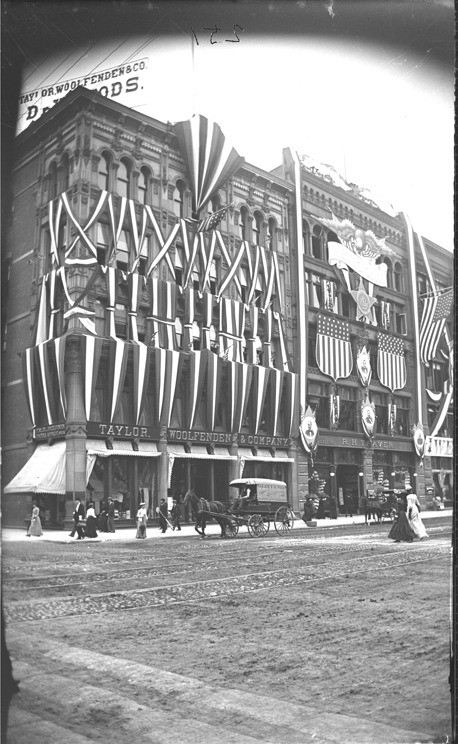 Corner of Woodward Ave. & State Street buildings for Taylor, Woolfender & Company dry goods and R.H. Traver clothing are decorated with bunting and images of presidents, women with umbrellas, a horse-drawn wagon from D. Levy & Sons and front of the buildings. Recorded in glass negative ledger: "D/Streets-Woodward & State."