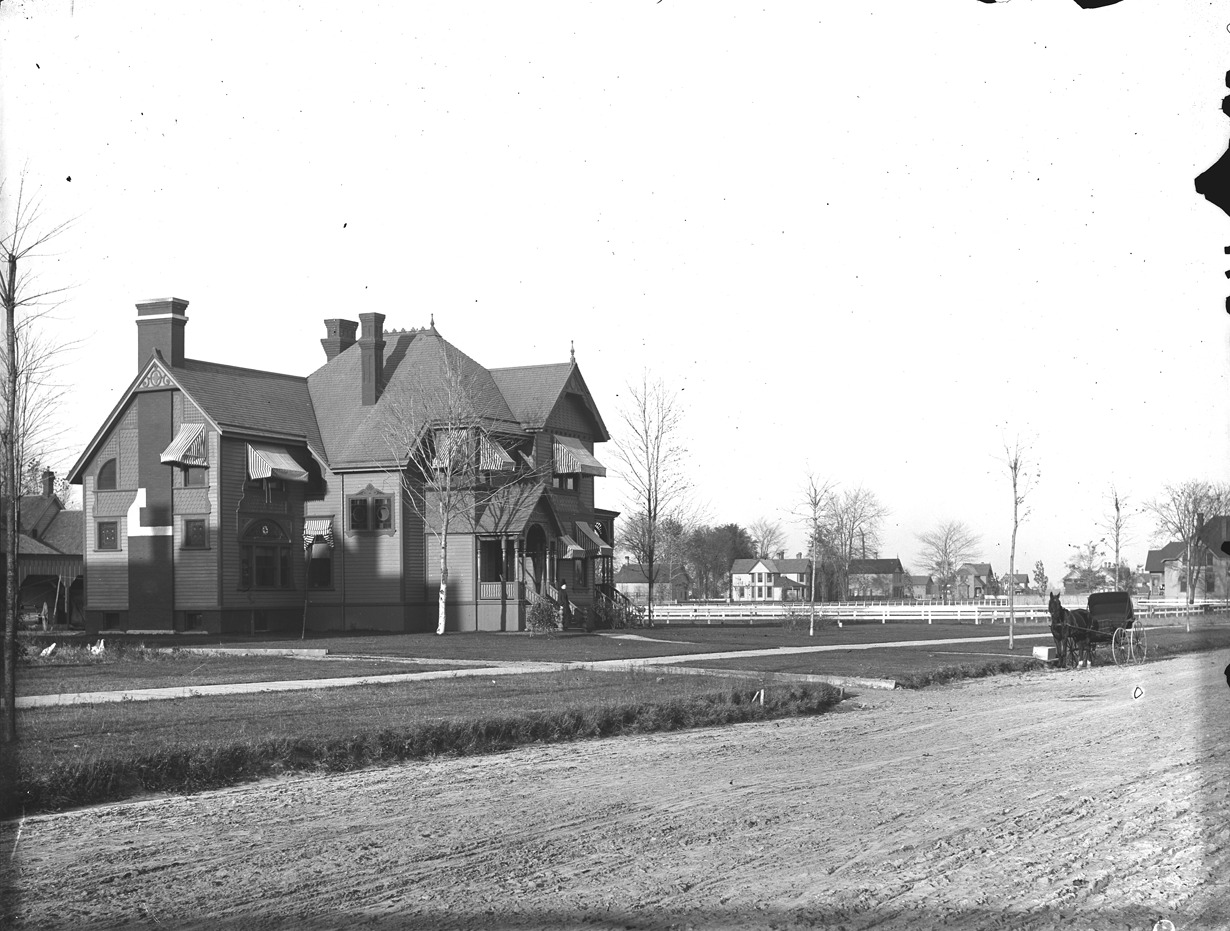 Large, Queen Anne-style house of James A. Randall, with striped awnings and stained-glass windows, a woman on the porch, some chickens in the yard, horse and buggy on dirt road. Recorded in glass negative ledger: "D/Historic houses-Randall, James A."