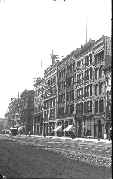 View of Metcalf Bros. & Co. and R.H. Traver with other businesses on Woodward Ave., with people on sidewalk and a view of the street. Recorded in glass negative ledger: "D/Streets-Woodward & Grand River."