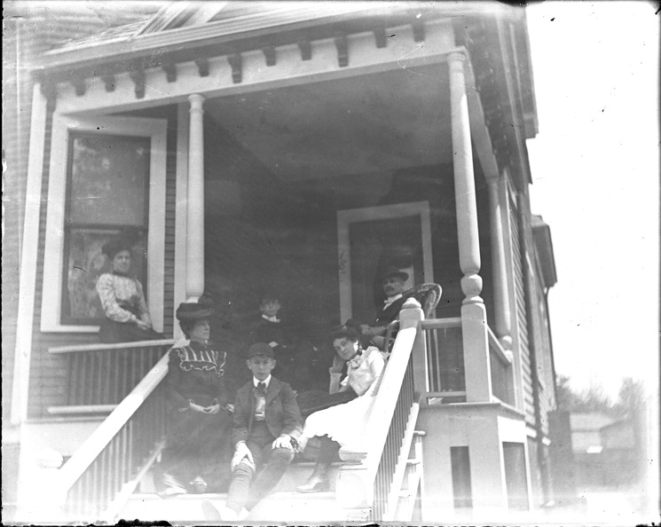 Favorite this☆ Group portrait on porch Description: People posed on the porch steps of a wood frame house. Recorded in glass negative ledger: "D/Historic houses." Details Resource ID: EB02e668 Subject: Porches--Michigan--Detroit Wooden-frame houses--Michigan--Detroit Portraits, Group Glass negatives Date Issued: Unknown year Format: 1 negative : glass ; 5 x 4 in. Member of: Burton Historical Collection Negative Number: BHC glass neg. no. 2289 Rights: Physical rights are retained by DPL. Copyright is retained in accordance with U.S. copyright laws.
