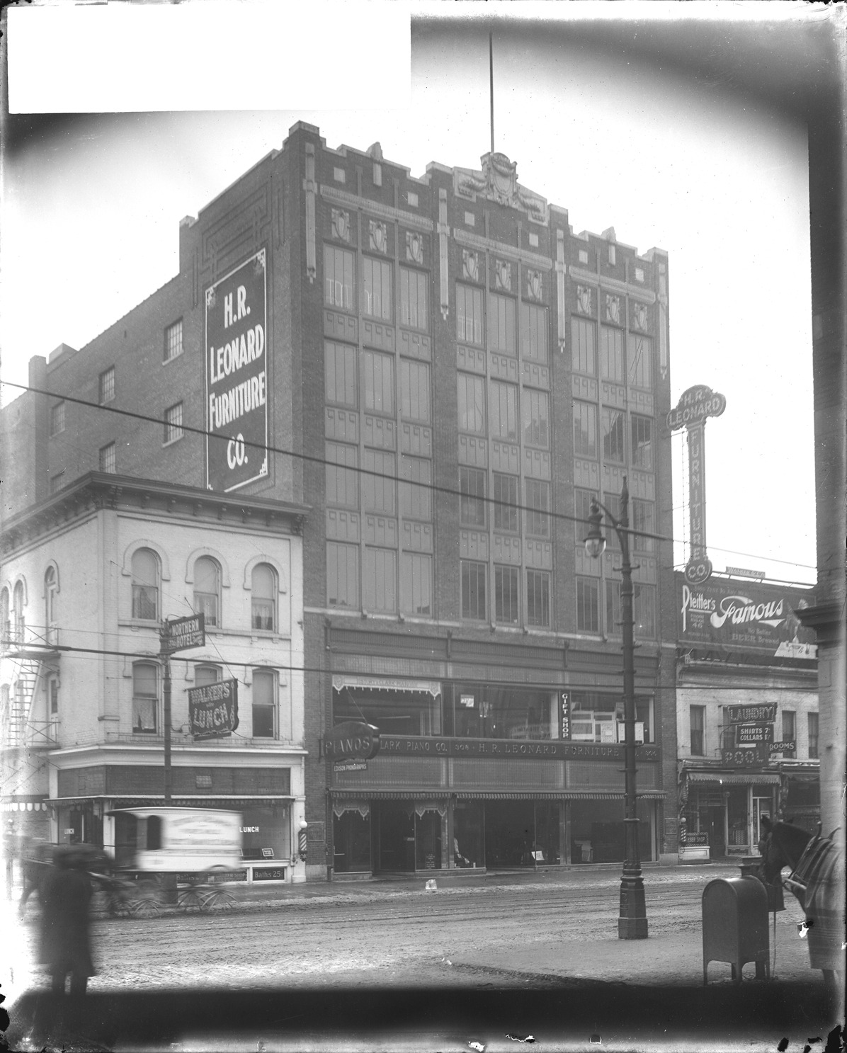 Favorite this☆ H.R. Leonard Furniture Company and Walker's Lunch Description: H.R. Leonard Furniture Company, a six-story brick building stands next to Walker's Lunch and the Northern Hotel, a horse-drawn delivery wagon is in front of Walker's. Recorded in glass negative ledger: "D/Industries & business houses-Leonard, H.R." Details Resource ID: EB02e700 Subject: Restaurants--Michigan--Detroit Hotels--Michigan--Detroit Furniture industry and trade--Michigan--Detroit Glass negatives Date Issued: Unknown year Format: 1 negative : glass ; 10 x 8 in. Member of: Burton Historical Collection Negative Number: BHC glass neg. no. 2322 Rights: Physical rights are retained by DPL. Copyright is retained in accordance with U.S. copyright laws.