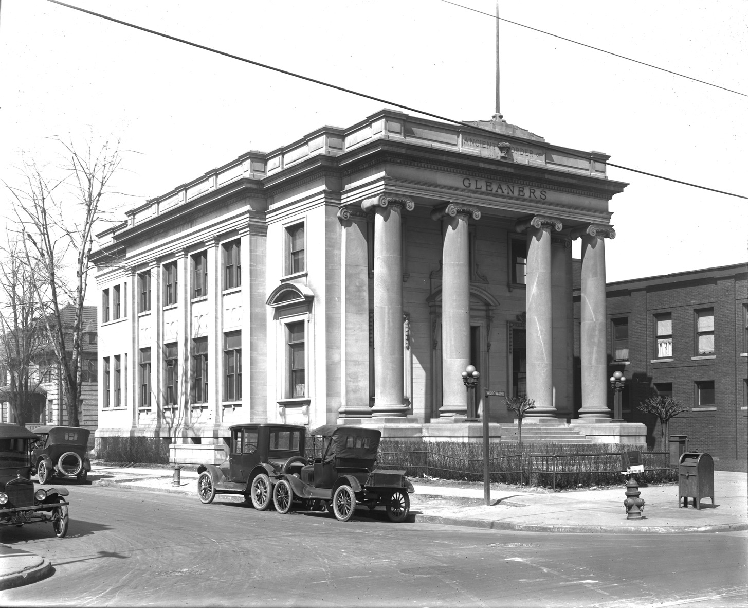 Stone columns adorn the Ionic, tetrastyle facade of Gleaners Temple at corner of Woodward and Palmer. The Ancient Order of Gleaners was originally an agricultural organization. The name was changed to Gleaner Life Insurance Society in 1931. Recorded in glass negative ledger: "D/Organizations."