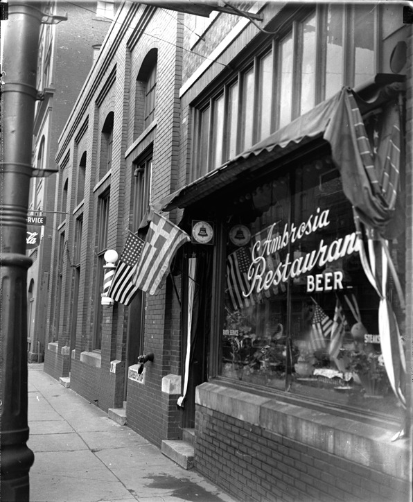 Favorite this☆ Ambrosia Restaurant Description: Window of Ambrosia Restaurant with U.S. and unidentified flag at entrance, telephone sign and barber pole in view. Recorded in glass negative ledger: "D/Restaurants-Ambrosia Restaurant." Details Resource ID: EB02e731 Subject: Restaurants--Michigan--Detroit Flags--Michigan--Detroit Glass negatives Date Issued: Unknown year Format: 1 negative : glass ; 5 x 4 in. Member of: Burton Historical Collection Negative Number: BHC glass neg. no. 2362 Rights: Physical rights are retained by DPL. Copyright is retained in accordance with U.S. copyright laws.