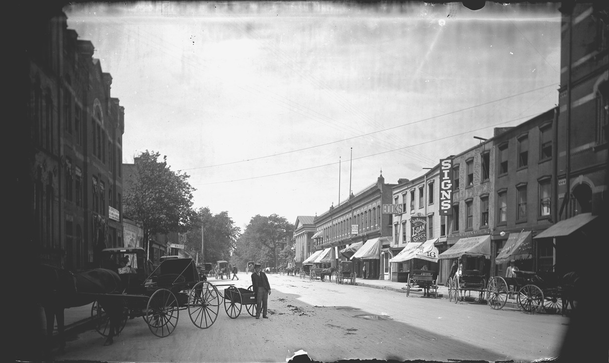 Horse-drawn buggies, man with hand-cart, and various businesses on Lafayette. Emulsion lifting from negative. Also have print from negative. Handwritten on albumen print mat front: "View west on Lafayette Ave. from Griswold St.. Building occupied as a book store is the original M.C.R.R. freight depot. Detroit." Sky enhanced with paint and details with ink on albumen print duplicate. Recorded in glass negative ledger: "D/Streets-Lafayette."