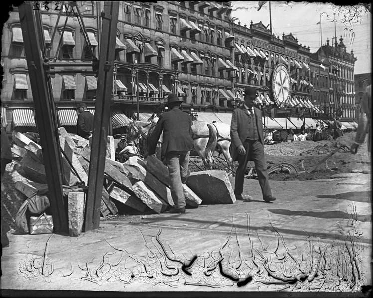 Men work on road in front of Mabley & Co. and the Russell House on Woodward Avenue. Stacks of broken pavement in foreground; digging in road; team of horses behind pedestrians. Emulsion pulling away from glass negative. Also have print from negative. Handwritten on print back: "S.E. cor. 1888. Russell House, Mabley & Company, 122-134 Woodward." Recorded in glass negative ledger: "D/Streets-Woodward & Campus Martius."