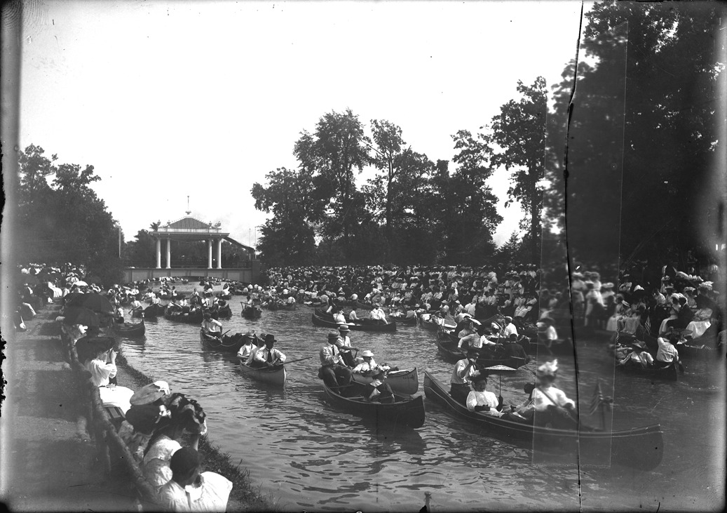 Large crowd gathers along the banks of a canal filled with people in canoes, as a concert band plays music under a gazebo in Belle Isle Park, in Detroit, Michigan. Recorded in glass negative ledger: "LD/Parks-Belle Isle-Concerts." Glass negative is cracked and taped.