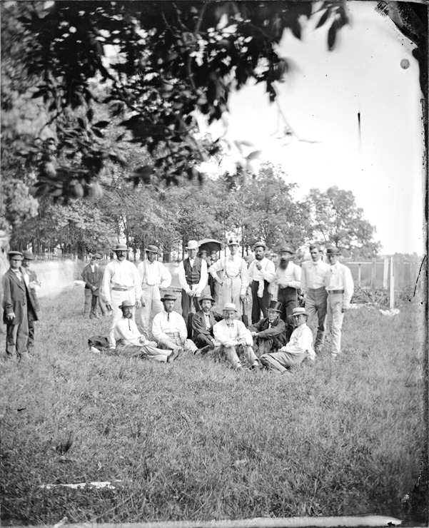 Group photo of members of the St. George's Cricket Club at Belle Isle Park, with trees in background. Recorded in glass negative ledger: "LD/Cycling."