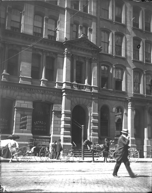 Favorite this☆ Businesses in the Buhl Block on Griswold Description: Buhl Block on Griswold with businesses such as Detroit Fire & Marine Insurance Co. and Detroit Savings Bank, with a view of the street. Recorded in glass negative ledger: "LD/Buildings-Buhl." Details Resource ID: EB02e806 Subject: Commercial buildings--Michigan--Detroit Insurance companies--Michigan--Detroit Streets--Michigan--Detroit Glass negatives Date Issued: Unknown year Format: 1 negative : glass ; 5 x 4 in. Member of: Burton Historical Collection Negative Number: BHC glass neg. no. 1966 Rights: Physical rights are retained by DPL. Copyright is retained in accordance with U.S. copyright laws.