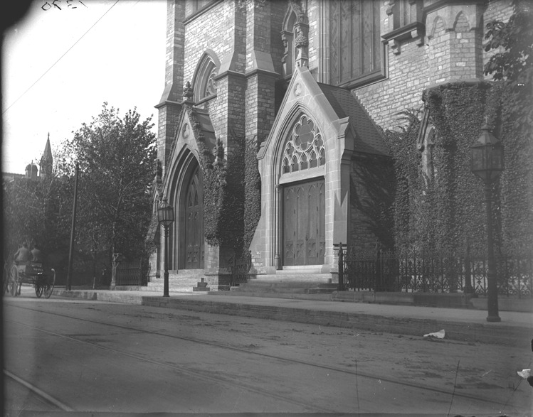 Favorite this☆ St. John's Protestant Episcopal Church Description: Entrance to St. John's Church at the corner of Woodward Avenue and High Street (Vernor). Recorded in glass negative ledger: "D/Churches-Prot. Ep.-St. John's." Details Resource ID: EB02e822 Subject: Anglican church buildings--Michigan--Detroit Streets--Michigan--Detroit Glass negatives Date Issued: Unknown year Format: 1 negative : glass ; 4 x 5 in. Member of: Burton Historical Collection Negative Number: BHC glass neg. no. 1985 Rights: Physical rights are retained by DPL. Copyright is retained in accordance with U.S. copyright laws.