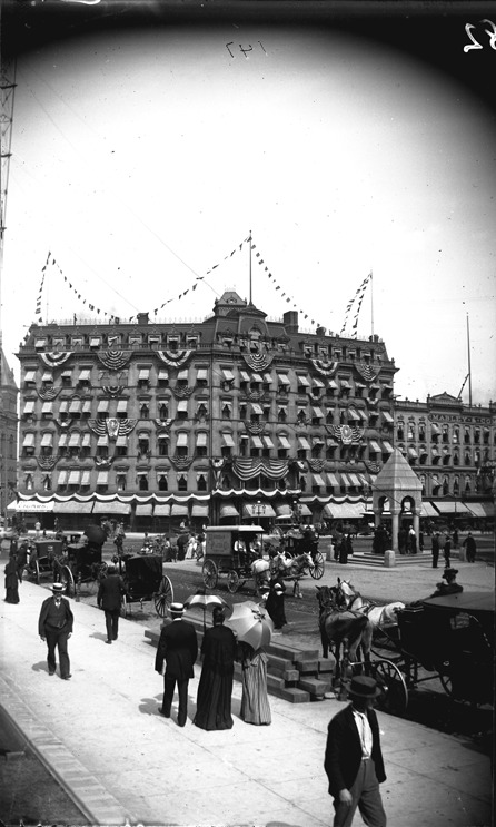 Pedestrians and horse-drawn vehicles in foreground with Russell House decorated with American flags and bunting for the G.A.R. 25th National Convention in background, and Bagley Memorial Fountain on right. Recorded in glass negative ledger: "D/Conventions-G.A.R.-25th nat'l. encampment, 1891."