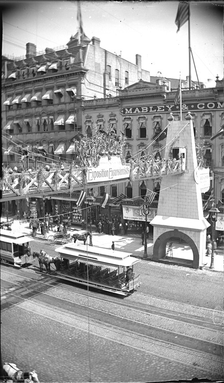 Bridge stands across Woodward Avenue in front of Mabley & Co., sign on bridge reads, "Exposition excursionists." Recorded in glass negative ledger: "D/Exhibitions-Detroit int. fair & exposition."