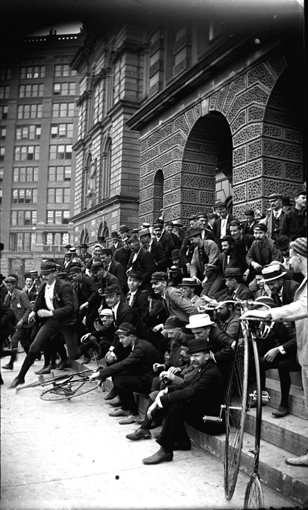 Group photo of the members of the Bicycle Club on the steps of the Detroit City Hall, man with unicycle in right foreground, group appears to be breaking up. Recorded in glass negative ledger: "D/Cycling."