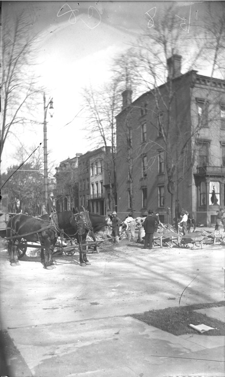 Road construction crew at work, with buildings in background and horses in foreground. Recorded in glass negative ledger: "D/Pavements."