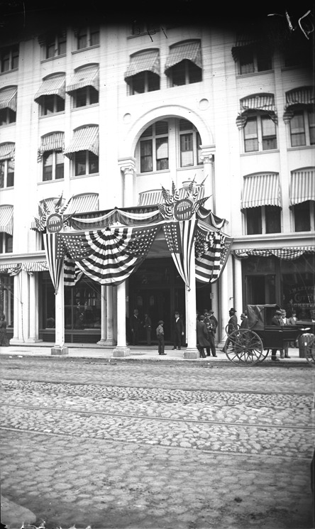 Favorite this☆ Russell House decorated with flags and bunting Description: View of Russell House at Cadillac Square decorated with American flags and bunting with view of cobblestone street in foreground. Recorded in glass negative ledger: "D/Hotels-Cadillac Sq." Details Resource ID: EB02e854 Subject: Hotels--Michigan--Detroit Cobblestone roads--Michigan--Detroit Bunting (Cloth) Glass negatives Date Issued: Unknown year Format: 1 negative : glass ; 5 x 3 in. Member of: Burton Historical Collection Negative Number: BHC glass neg. no. 2521 Rights: Physical rights are retained by DPL. Copyright is retained in accordance with U.S. copyright laws.