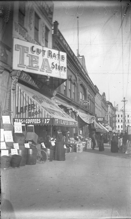 Favorite this☆ Lafer Bros. Cut Rate Tea store Description: Shoppers and barrels in front of Lafer Bros. Cut Rate Tea store on Cadillac Square, other signs visible include The Salvation Army and Marx's Market. Recorded in glass negative ledger: "D/Streets-Cadillac Square." Details Resource ID: EB02e857 Subject: Grocery trade--Michigan--Detroit Markets--Michigan--Detroit Glass negatives Date Issued: Unknown year Format: 1 negative : glass ; 5 x 3 in. Member of: Burton Historical Collection Negative Number: BHC glass neg. no. 2524 Rights: Physical rights are retained by DPL. Copyright is retained in accordance with U.S. copyright laws.