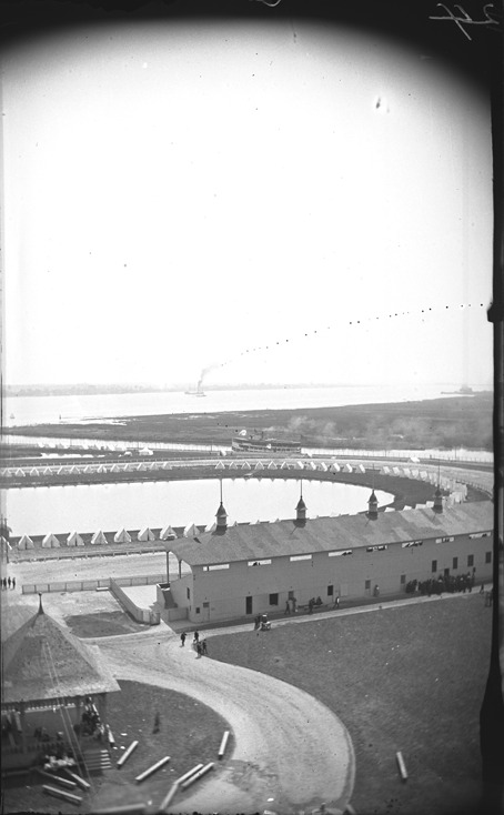 Aerial view of race track at the Detroit International Fair and Exposition, with tents, side by side, all along track and the Detroit River in the background. Recorded in glass negative ledger: "D/Exhibitions-Detroit int'l fair & expo."