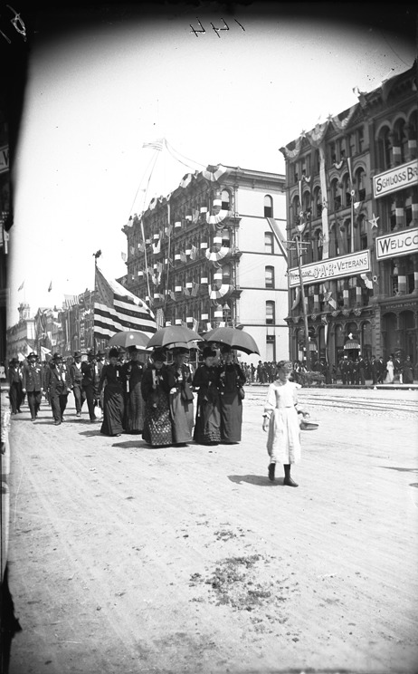 Girl followed by a group of women with umbrellas lead G.A.R. members in G.A.R. 25th National Encampment parade, with decorated buildings on right. Recorded in glass negative ledger: "D/Conventions-G.A.R.-25th nat'l. encampment, 1891."