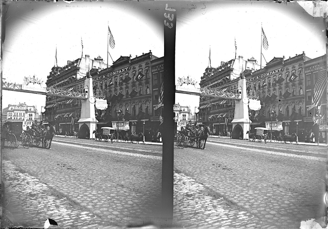 Bridge stands across Woodward Avenue in front of Mabley & Co., sign on bridge reads, "Exposition excursions headquarters." Horse-drawn wagon on street in foreground. Glass negative is stereo image. Recorded in glass negative ledger: "D/Exhibitions-Detroit international fair & exposition."