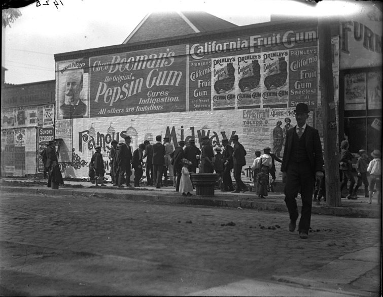 Favorite this☆ Signs on side of building Description: Signs for Beeman's pepsin gum, California fruit gum and a circus, among others, are posted on the side of a building, with a view of the street. Recorded in glass negative ledger: "D/Billboards." Details Resource ID: EB02e949 Subject: Signs and signboards--Michigan--Detroit Commercial buildings--Michigan--Detroit Streets--Michigan--Detroit Glass negatives Date Issued: Unknown year Format: 1 negative : glass ; 4 x 5 in. Member of: Burton Historical Collection Negative Number: BHC glass neg. no. 2634 Rights: Physical rights are retained by DPL. Copyright is retained in accordance with U.S. copyright laws.