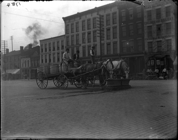 Favorite this☆ Team of horses drink at water trough Description: Team of horses drinks from a street water trough, with buildings in background. Recorded in glass negative ledger: "D/Horses." Details Resource ID: EB02e959 Subject: Horse-drawn vehicles--Michigan--Detroit Horses--Michigan--Detroit Watering troughs--Michigan--Detroit Streets--Michigan--Detroit Glass negatives Date Issued: Unknown year Format: 1 negative : glass ; 4 x 5 in. Member of: Burton Historical Collection Negative Number: BHC glass neg. no. 2644 Rights: Physical rights are retained by DPL. Copyright is retained in accordance with U.S. copyright laws.