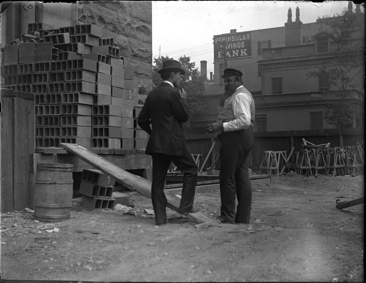 Favorite this☆ U.S. Post Office building site Description: Two men talk at Post Office building site in foreground surrounded by bricks and sawhorses, with the Peninsular Savings Bank in background. Recorded in glass negative ledger: "D/Buildings-Federal-Post office (1897)." Details Resource ID: EB02e960 Subject: Post office buildings--Michigan--Detroit Building sites--Michigan--Detroit Bank buildings--Michigan--Detroit Glass negatives Date Issued: Unknown year Format: 1 negative : glass ; 4 x 5 in. Member of: Burton Historical Collection Negative Number: BHC glass neg. no. 2645 Rights: Physical rights are retained by DPL. Copyright is retained in accordance with U.S. copyright laws.