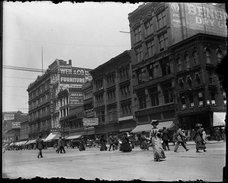 View of Woodward Avenue with businesses such as Mableys, Weil & Co., and Benson Co., with pedestrians in street. Recorded in glass negative ledger: "LD/Streets-Woodward, May 11, 1910, 11:35 am." Written on original glass negative envelope: "East side Gratiot to Grand River looking north."
