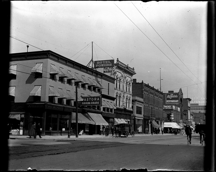 Hotel Powers and other businesses such as, Woodward Candy Kitchen, Trickey Meat & Groceries and La Childs restaurant along one side of Woodward Avenue. Recorded in glass negative ledger: "LD/Streets-Woodward, c.1910, 7:30 am." Written on original glass negative envelope: "West side from Elizabeth to Columbia looking north, signs for Pastora Havana Cigars, Hotel Powers and Faltis Market."