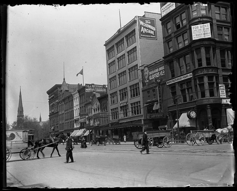 Businesses along one side of Woodward Avenue such as Manufacturers Piano Co., Woodward Arcade and Victor, Edison records. Recorded in glass negative ledger: "LD/Streets-Woodward, May 11, 1910, 11:30 am." Written on original glass negative envelope: "East side John R to Witherell looking north, signs: C.J. Netting mantels & chandeliers, Woodward Arcade, solid gold glasses $1 up."